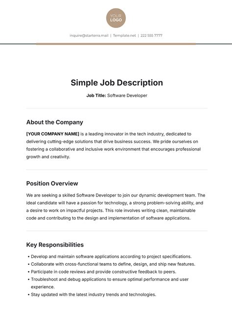 Simple Job Description Template - A great job description template makes it simple to list the job duties and responsibilities for every job in your company. Download 6 free and editable job description templates for different professions and organisations. A job description template describes the role, responsibilities, and skills required for a job opening. Optimized for job board approval and seo, our 1000+ job description.